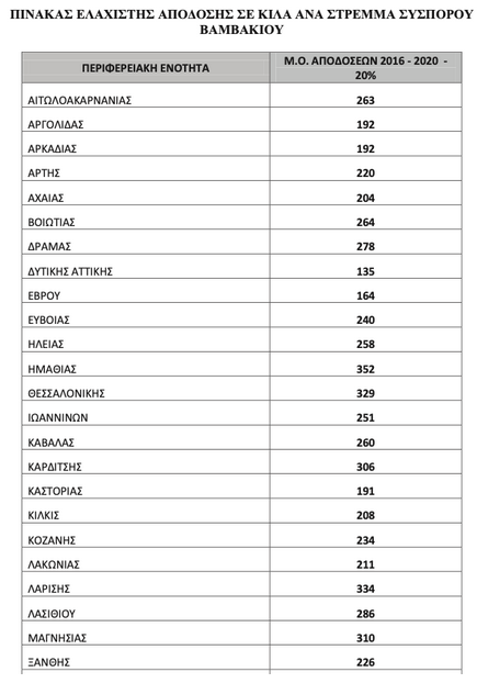 Σύμφωνα με την απόφαση, η ελάχιστη στρεμματική απόδοση ορίζεται σε επίπεδο περιφερειακής ενότητας (νομός), με βάση το μέσο όρο της πραγματικής στρεμματικής απόδοσης της πενταετίας 2016-2020 κάθε περιφερειακής ενότητας, μειωμένο κατά 20%. Έτσι στο Ν. Καρδίτσας απαιτούνται πλέον κατ’ ελάχιστο 306 κιλά το στρέμμα, ενώ στην περασμένη περίοδο 211 κιλά. Στο Νομό Λάρισας επίσης είναι αυξημένη καθώς ανέρχεται στα 334 κιλά, ενώ στη Μαγνησία στα 310 κιλά