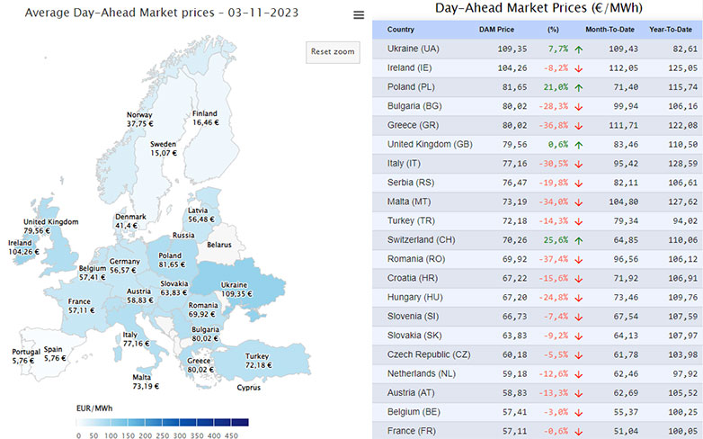Στον χάρτη αποτυπώνεται, για την τρέχουσα ημέρα, η μέση ημερήσια τιμή (€/MWh) της χονδρεμπορικής Αγοράς Επόμενης Ημέρας για κάθε ευρωπαϊκό κράτος.