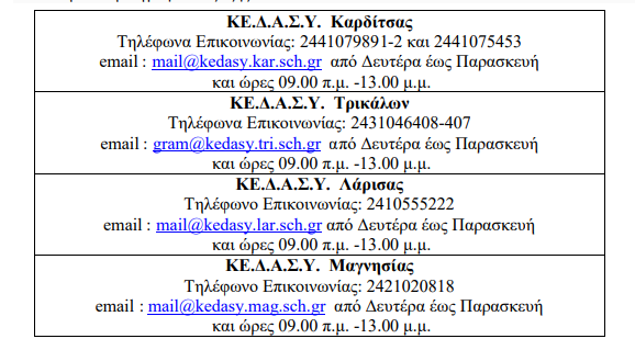 τηλεφωνικές γραμμές ψυχολογικής υποστήριξης στα ΚΕ.ΔΑ.Σ.Υ. της Π.Δ.Ε. Θεσσαλίας που