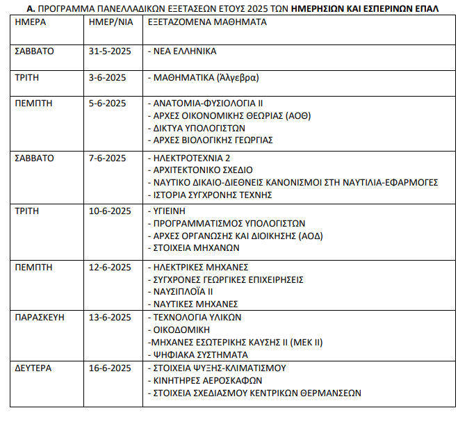 Α. ΠΡΟΓΡΑΜΜΑ ΠΑΝΕΛΛΑΔΙΚΩΝ ΕΞΕΤΑΣΕΩΝ ΕΤΟΥΣ 2025 ΤΩΝ ΗΜΕΡΗΣΙΩΝ ΚΑΙ ΕΣΠΕΡΙΝΩΝ ΕΠΑΛ