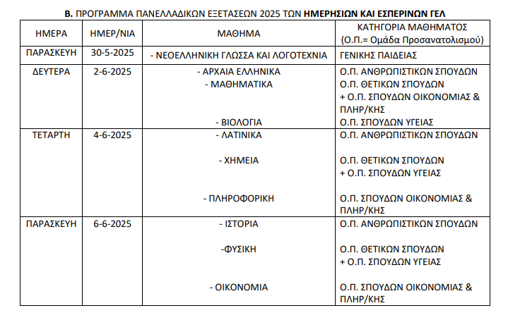 Β. ΠΡΟΓΡΑΜΜΑ ΠΑΝΕΛΛΑΔΙΚΩΝ ΕΞΕΤΑΣΕΩΝ 2025 ΤΩΝ ΗΜΕΡΗΣΙΩΝ ΚΑΙ ΕΣΠΕΡΙΝΩΝ ΓΕΛ