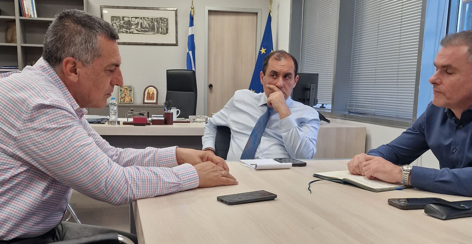 Μέσα σε ιδιαίτερα θετικό και εποικοδομητικό κλίμα πραγματοποιήθηκε σήμερα στην Αθήνα η συνάντηση του Περιφερειάρχη Θεσσαλίας κ. Δημήτρη Κουρέτα με τον Υφυπουργό Κλιματικής Κρίσης και Πολιτικής Προστασίας, κ. Κώστα Κατσαφάδο και τον Γ.Γ. Κρατικής Αρωγής Πέτρο Καμπούρη.