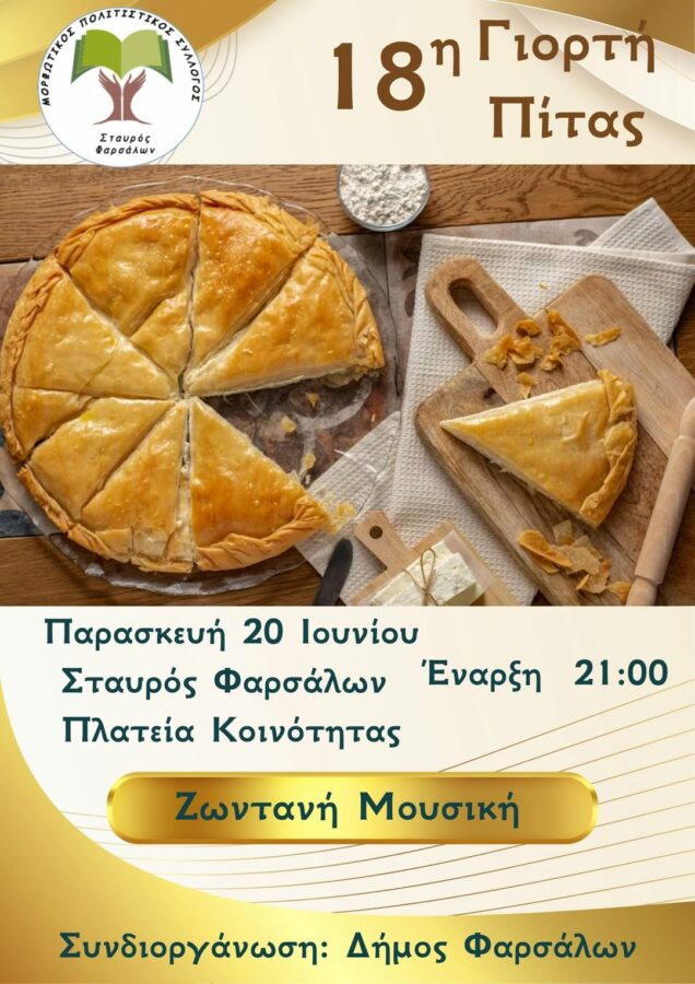 Την 18η Γιορτή Πίτας διοργανώνει την Παρασκευή 20 Ιουνίου στις 21:00 το βράδυ, στην Πλατεία Κοινότητας του χωριού, ο Πολιτιστικός Σύλλογος Σταυρού Φαρσάλων.