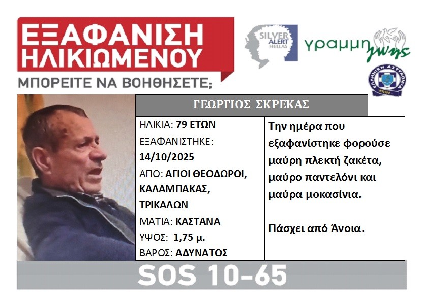 Ο Γεώργιος Σκρέκας που αγνοείται απο το πρωί της Τρίτης 14 Οκτωβρίου, είναι 79 χρόνων και η κατοικία του βρίσκεται στους Αγίους Θεοδώρους Καλαμπάκας, Τρικάλων.