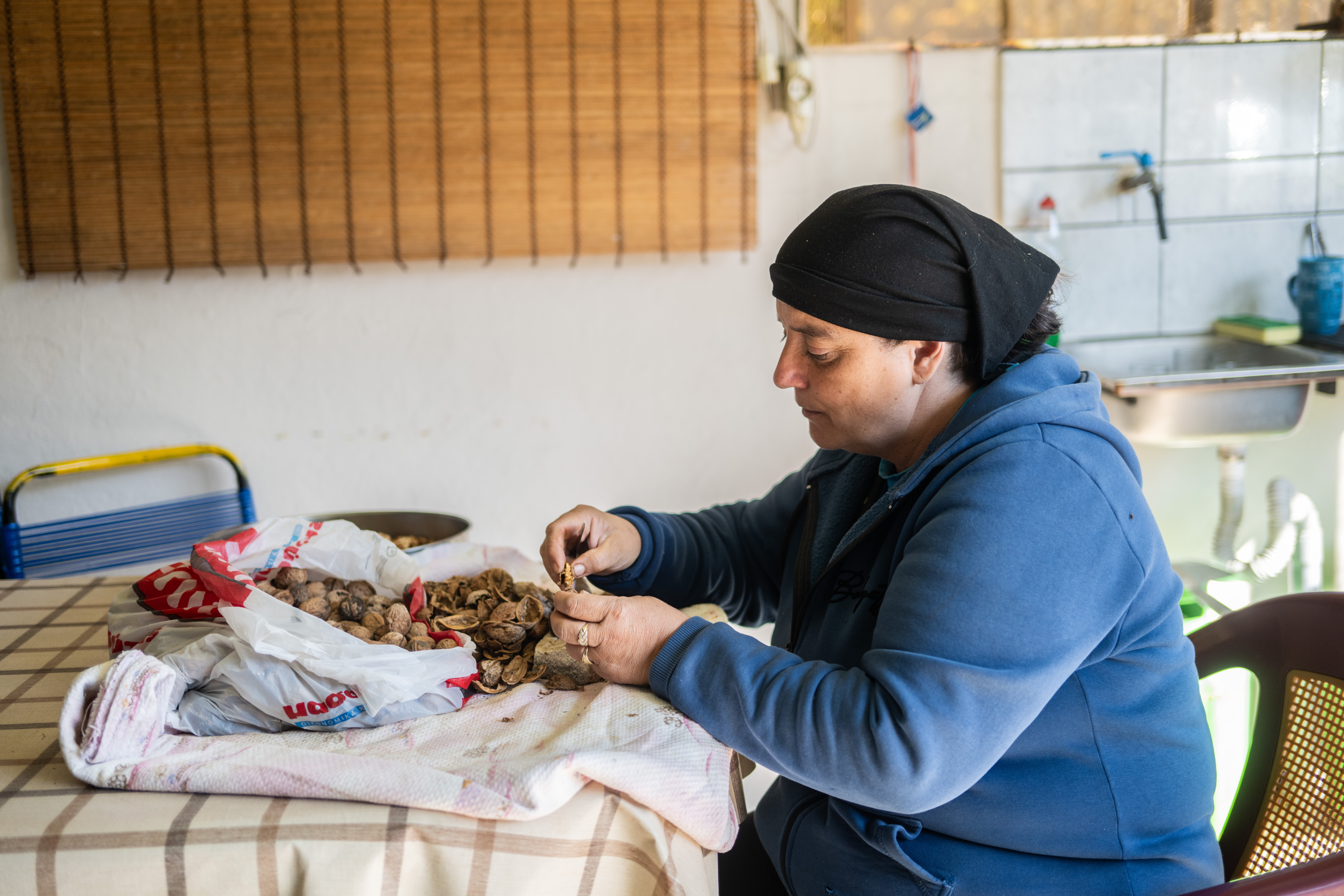 «Περάστε μέσα!», μας προσκαλεί με ζεστασιά στη φωνή της, χωρίς να σταματήσει τη δουλειά της. «Καθίστε να δοκιμάσετε τα φετινά καρύδια. Είναι από τις καρυδιές μας, εδώ στο χωριό». Η γεύση τους είναι πράγματι αποκάλυψη -γλυκιά και βουτυράτη, με εκείνη την ιδιαίτερη φρεσκάδα που έχουν τα μόλις συλλεγμένα καρύδια.