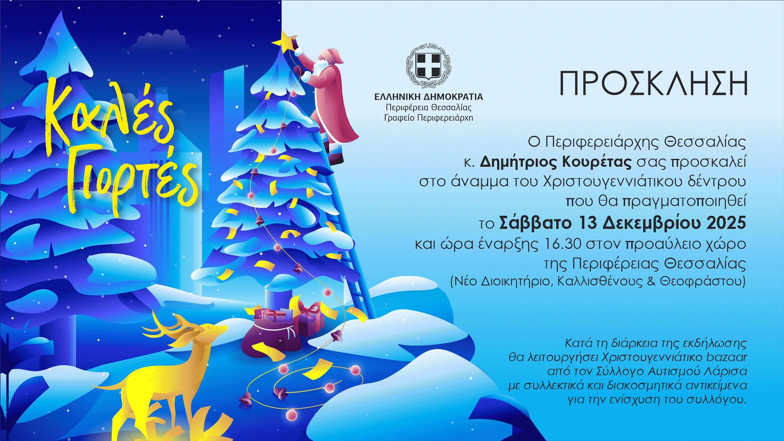 Η Περιφέρεια Θεσσαλίας δίνει το έναυσμα για την επίσημη έναρξη της εορταστικής περιόδου με μια μεγάλη χριστουγεννιάτικη εκδήλωση που θα πραγματοποιηθεί το Σάββατο 13 Δεκεμβρίου, ώρα 16:30, στον προαύλιο χώρο του Νέου Διοικητηρίου της Περιφέρειας Θεσσαλίας (Καλλισθένους & Θεοφράστου). Η βραδιά θα κορυφωθεί με το άναμμα του Χριστουγεννιάτικου Δέντρου, σε μια γιορτή ανοιχτή για μικρούς και μεγάλους.