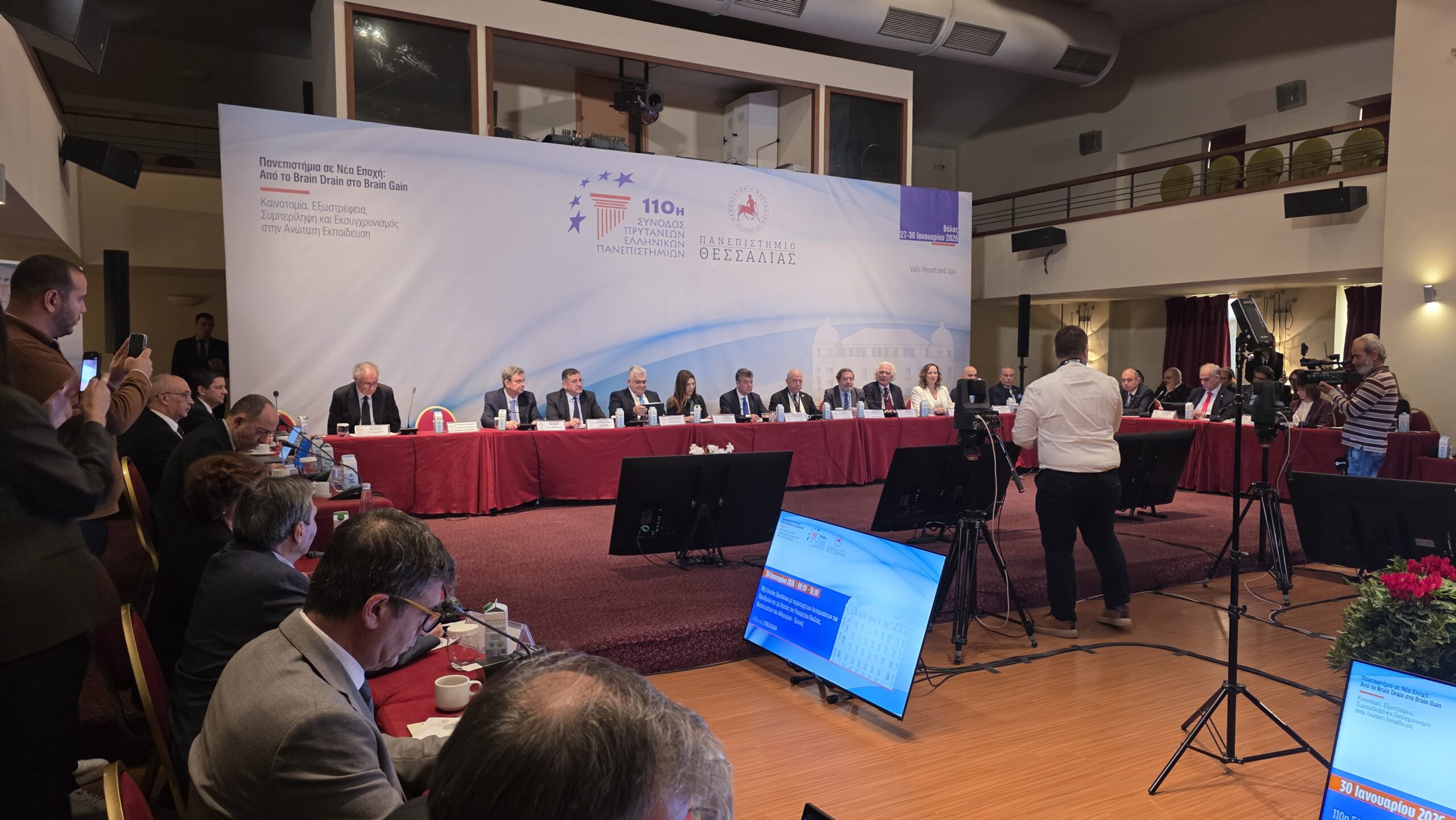 Στις εργασίες της τελευταίας ημέρας της Συνόδου των Πρυτάνεων, η οποία διεξάγεται υπό την προεδρία του Πανεπιστημίου Θεσσαλίας, βρέθηκε η Υπουργός Παιδείας κ. Σοφία Ζαχαράκη και άκουσε όλους τους προβληματισμούς και τα αιτήματα των 24 Πρυτάνεων των ελληνικών δημοσίων πανεπιστημίων. Η ίδια, σε δηλώσεις της μετά το πέρας της κλειστής συνεδρίασης, υπογράμμισε μεταξύ άλλων ότι το ελληνικό δημόσιο Πανεπιστήμιο είναι η δύναμη της ελληνικής κοινωνίας. Η Υπουργός μετέφερε τη στρατηγική, που ακολουθεί το Υπουργείο Παιδείας για την ενίσχυση της στέγασης των φοιτητών και ανακοίνωσε ότι το 2028, το πολύ το 2029 θα είναι έτοιμες και οι φοιτητικές εστίες του ΠΘ, στον Βόλο, στην περιοχή της Βαμβακουργίας, ενώ προανήγγελλε δράσεις για την ενίσχυση και της σίτισης των φοιτητών.